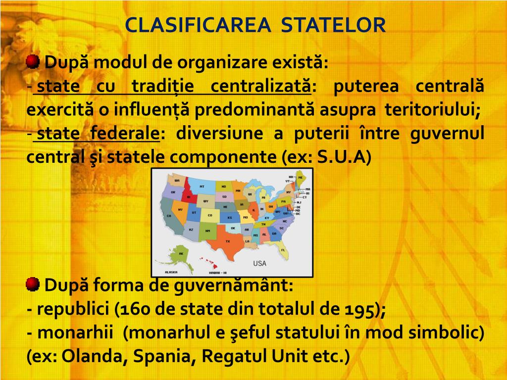 Apr 20, 2019 · a.state federative, care constituie o comunitate de state nesuverane, ce presupune un stat central cu competenta si personalitate distincte de cele ale statelor membre. Potrivit formei de guvernământ, statele se împart în două categorii: Oct 29, 2013 · forma de guvernamant. Șeful statului poartă denumirea de rege, monarh, domn, împărat etc.
